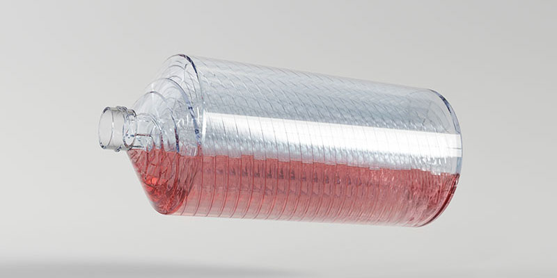 Der Ansatz ist simpel: „Wir wollen so viel Oberfläche in die Flasche bringen, wie möglich“, sagt Dr. Lukas Käßer, der zu Jahresbeginn zum Team gestoßen ist und die Forschung und Entwicklung voranbringt. Weniger simpel ist die Umsetzung. Denn wäre dies mit etablierter Technologie so einfach möglich, hätte das wohl schon einer der weltweit vier großen Anbieter entsprechender Gefäße getan. Herzstück der Rollerflaschen von Green Elephant sind zehn ineinander verschränkte Förderschnecken und im Kern ein Hohlrohr. Die Nährflüssigkeit verteilt sich beim Drehen gleichmäßig in den Hohlräumen der Kammern und fließt anschließend durch das Rohr wieder zurück.