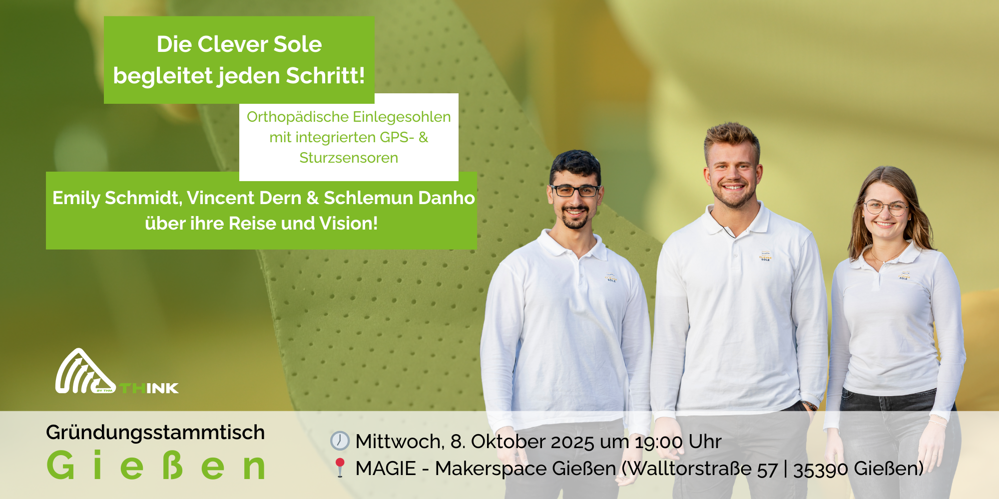 Emily Schmidt, Vincent Dern und Schlemun Danho, Gewinner:innen des Hessischen Gründerpreises 2024 in Kategorie Gründung aus der Hochschule, stellen ihre Innovation vor: eine orthopädische Einlegesohle mit integriertem GPS-Sensor, die speziell zum Schutz von an Demenz erkrankten Senioren konzipiert wurde. Durch ihre Erfahrungen im Studium und den engen Austausch mit Betroffenen und Fachkräften in der Pflege haben sie eine Lösung entwickelt, die Sicherheit bietet, ohne den Alltag der Betroffenen zu beeinträchtigen.