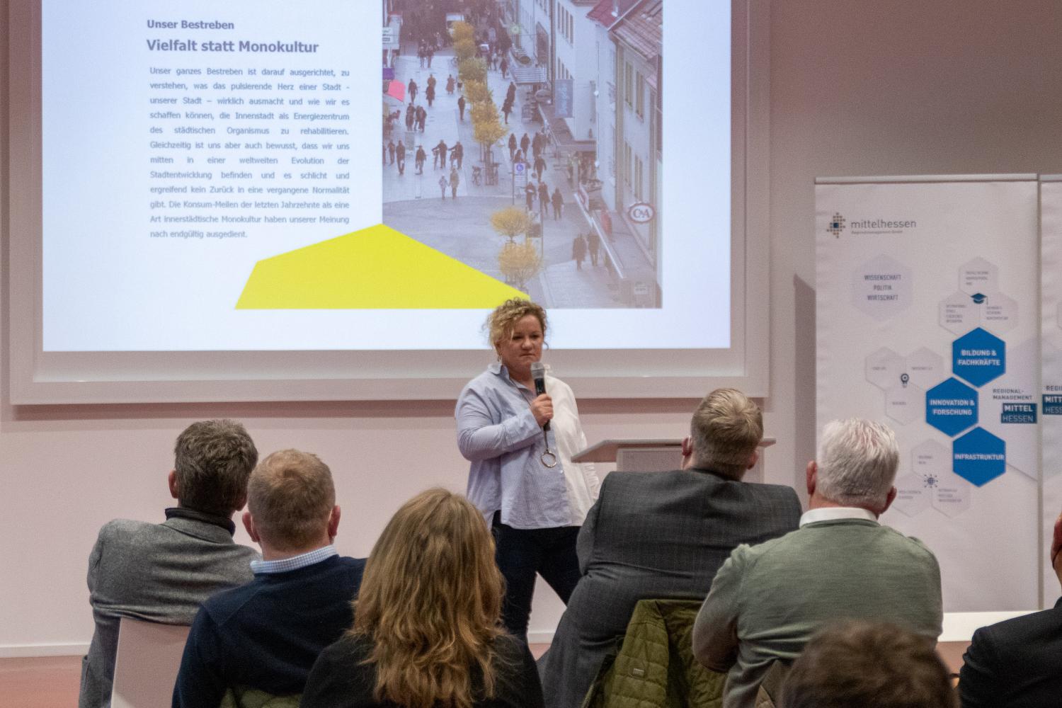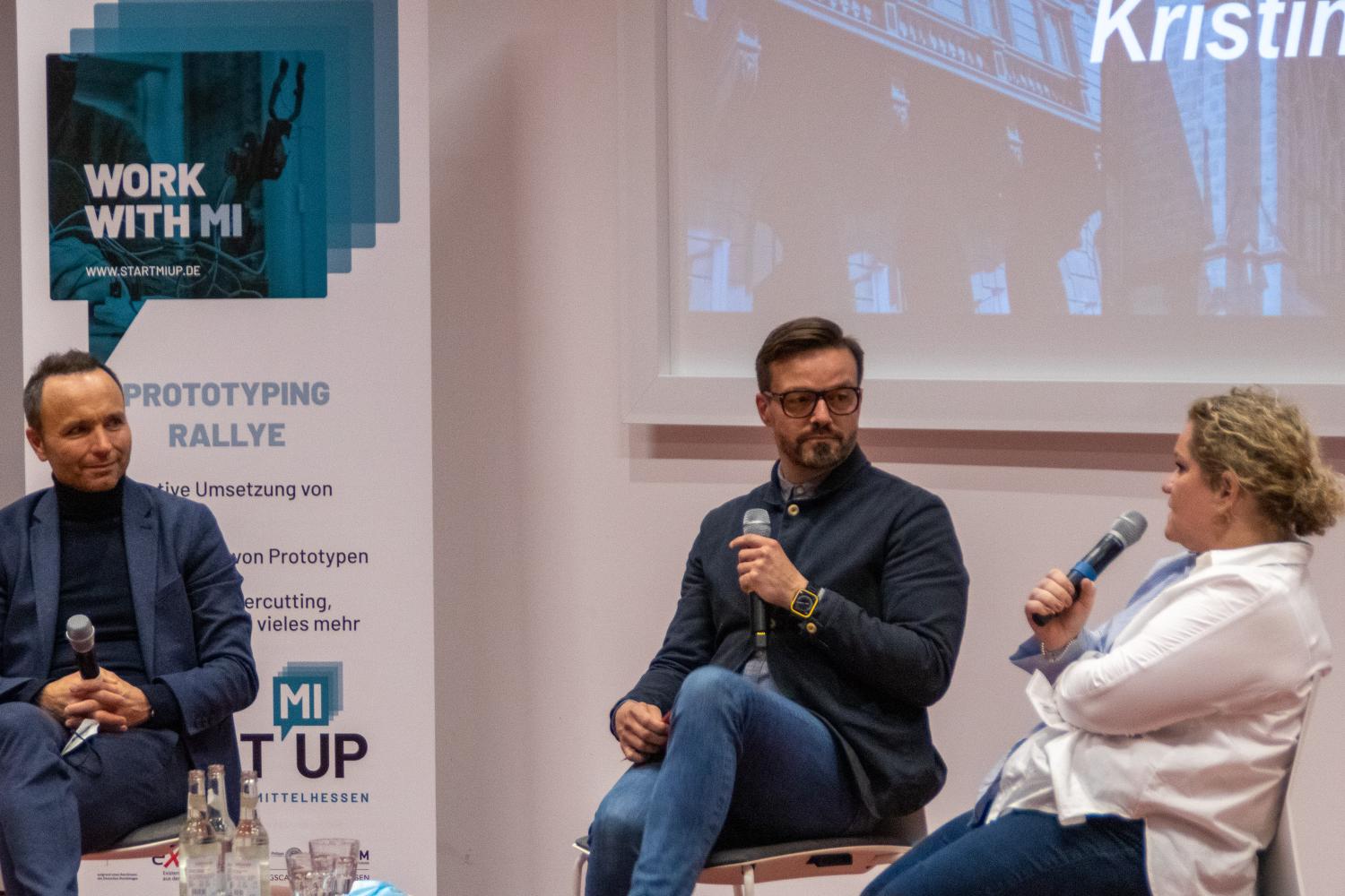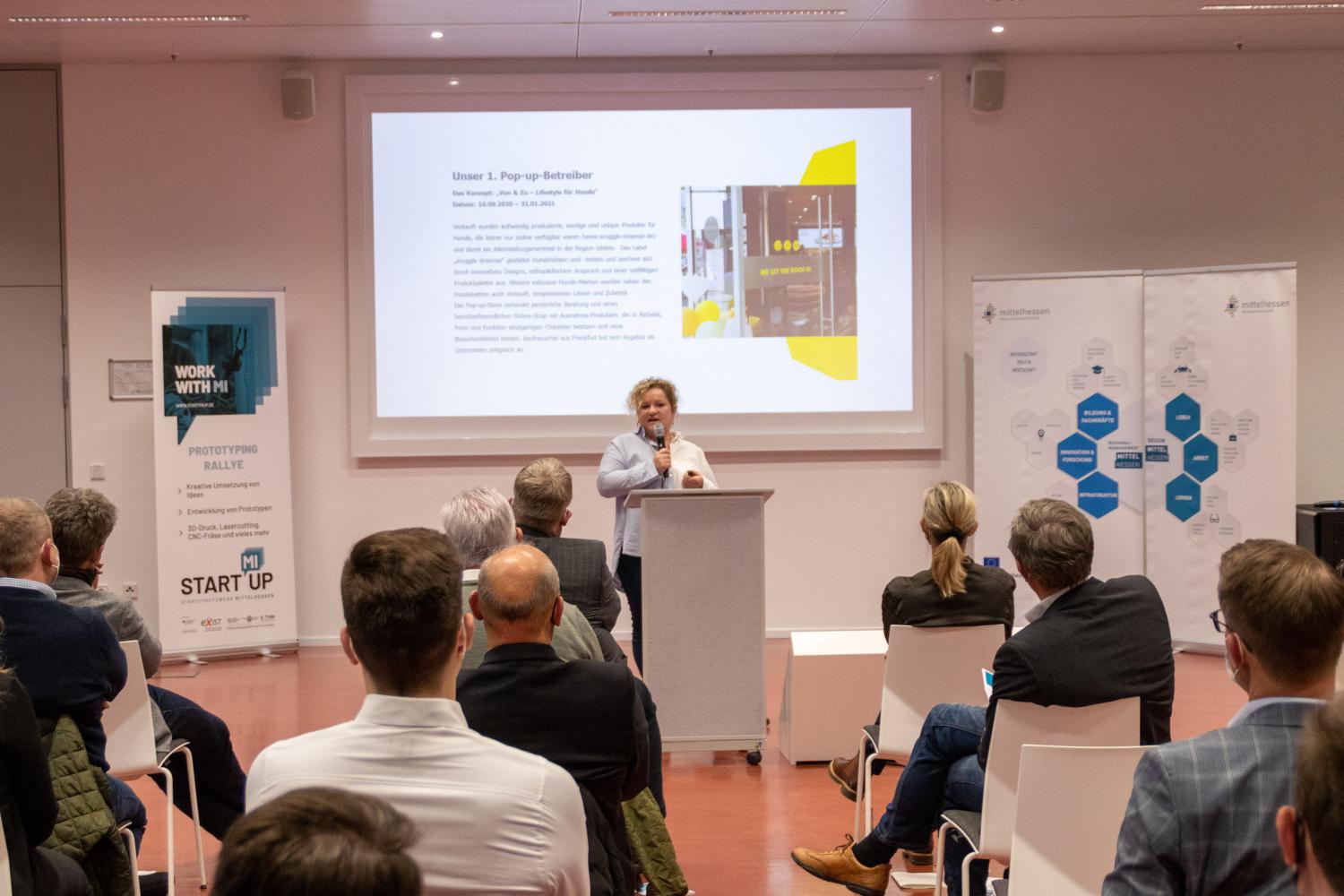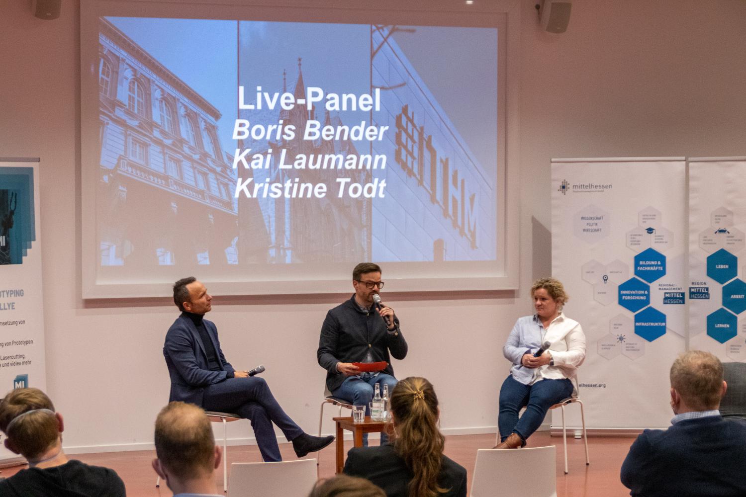 Die Zuschauerinnen und Zuschauer bekamen nach einem Grußwort des frischgebackenen Präsidenten der Philipps-Universität Marburg, Prof. Dr. Thomas Nauss, bei kurzweiligen und abwechslungsreichen Ideen- und Prototypenpitches einen Einblick in das Erarbeitete der Rallye-Teilnehmer:innen. Abgerundet wurde der Abend durch interessante Expert:innenbeiträge zum Thema Innenstadtentwicklung. Hierfür, ebenso wie bereits zum Kickoff der Rallye konnte die Regionalmanagement Mittelhessen GmbH dank ihrer vielzähligen Netzwerkkontakte ausgewiesene Expertinnen aufbieten. Frau Kristine Todt vom Stadtmarketing der Stadt Hanau gab Einblicke in das dortige Projekt „Hanau aufLaden“. Im Anschluss gab es noch einen Live-Podcast mit dem Transformationsexperten Boris Bender, Immobilienentwickler Kai Laumann sowie Kristine Todt zum Thema.